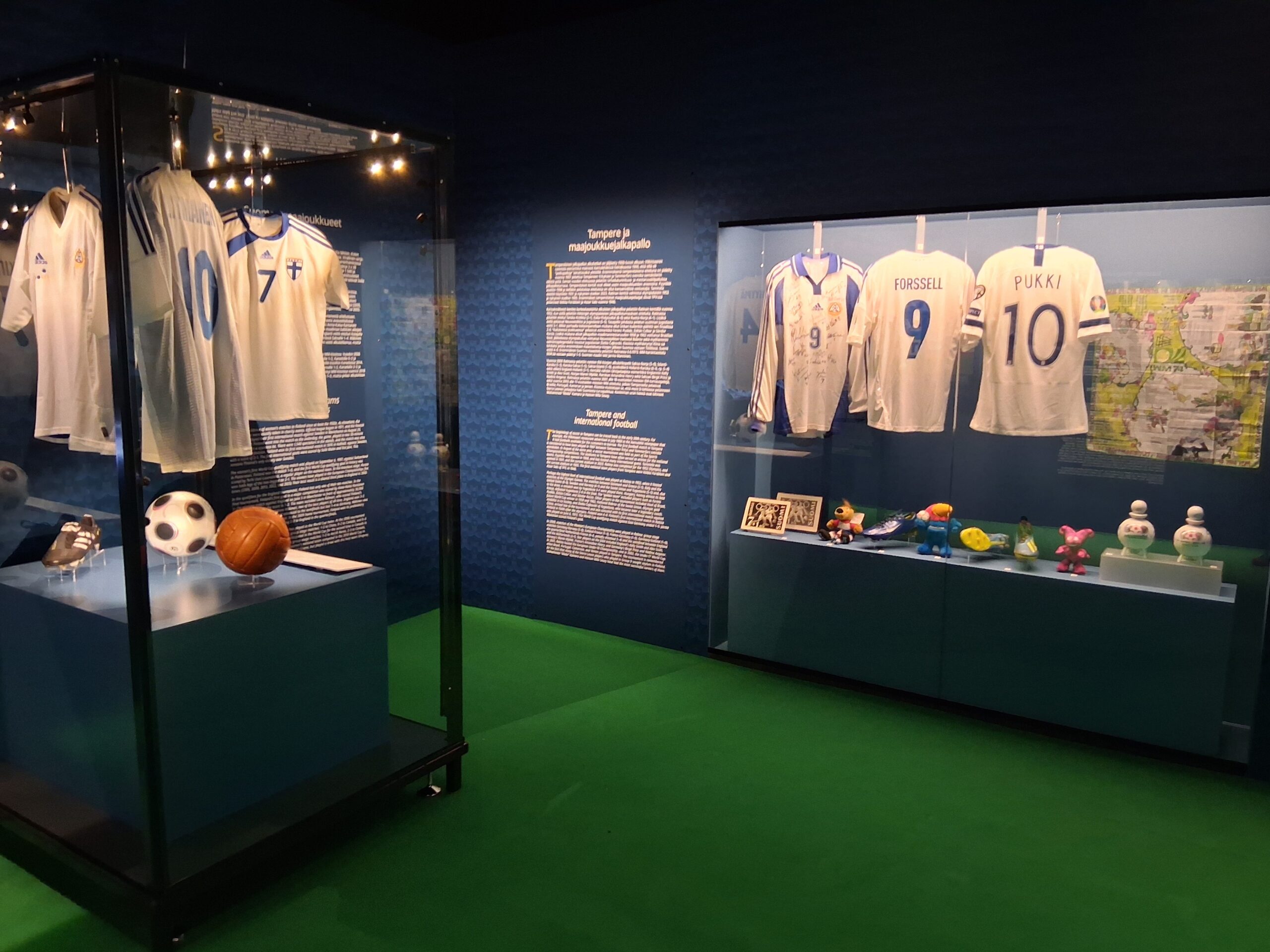 Suomalaiselle jalkapallolle omistetussa osuudessa on runsaasti Tahdon kokoelmasta lainattuja esineitä. Esillä ovat muun muassa pelipallo Suomen ja puolustavan maailmanmestarin Italian ottelusta Helsingin Olympiastadionilla vuonna 1939, Anne Mäkisen pelipaita EM-kotikisoista 2009, Sami Hyypiän ja Mikael Forssellin pelikengät sekä Tampereelle palaava Teemu Pukin maajoukkuepaita. Pukki käytti paitaa kesäkuussa 2019 Ratinan stadionilla upottaessaan kahdella maalillaan Bosnia ja Hertsegovinan tärkeässä EM-karsintaottelussa.